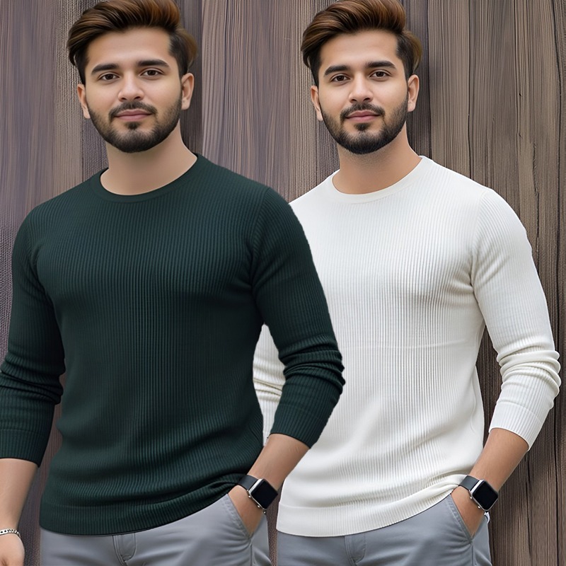 2 Pcs Men’s Premium 2/2 Rib Full Sleeve T-shirt – Green +White