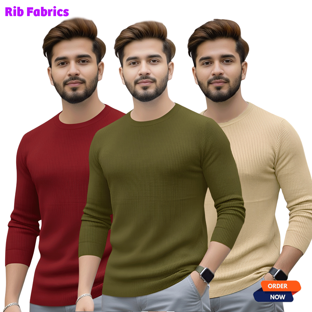3 Pcs Men’s Premium 2/2 Rib Full Sleeve T-shirt – Olive+Meroon+Cream